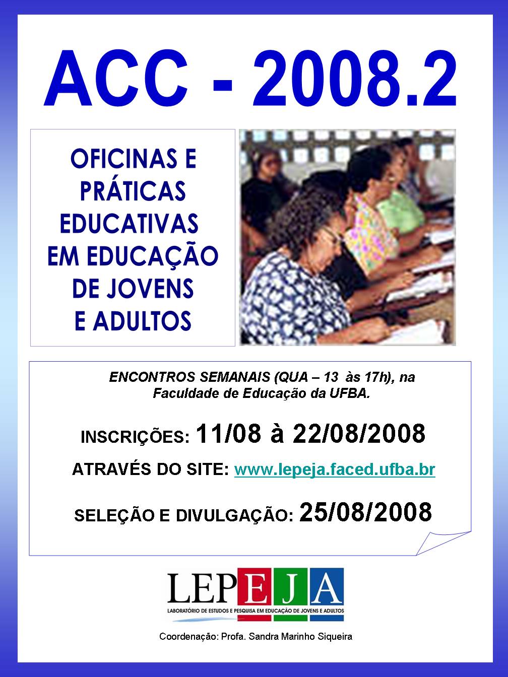 ACC454 - OFICINAS E PRÁTICAS EDUCATIVAS EM EDUCAÇÃO DE JOVENS E ADULTOSSEMESTRE 2008.2 - * Ficha de Inscrição![]()