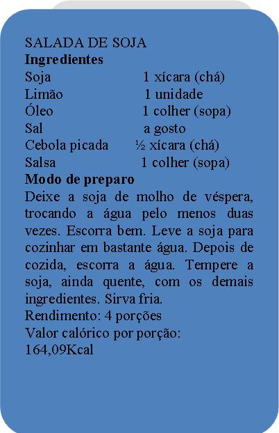 Além de possuir alto valor nutricional, ela é um potente inibidor de doenças, por possuir várias substâncias com ação preventiva. Ela pode agir em nosso corpo de várias formas: previne a osteoporose e o câncer de mama, de próstata e de cólon; ameniza os sintomas da menopausa e reduz os níveis de colesterol. Diante de tantos benefícios, que tal incluir a soja no cardápio, preparando uma salada de soja para servir no almoço! A receita é bem simples:
